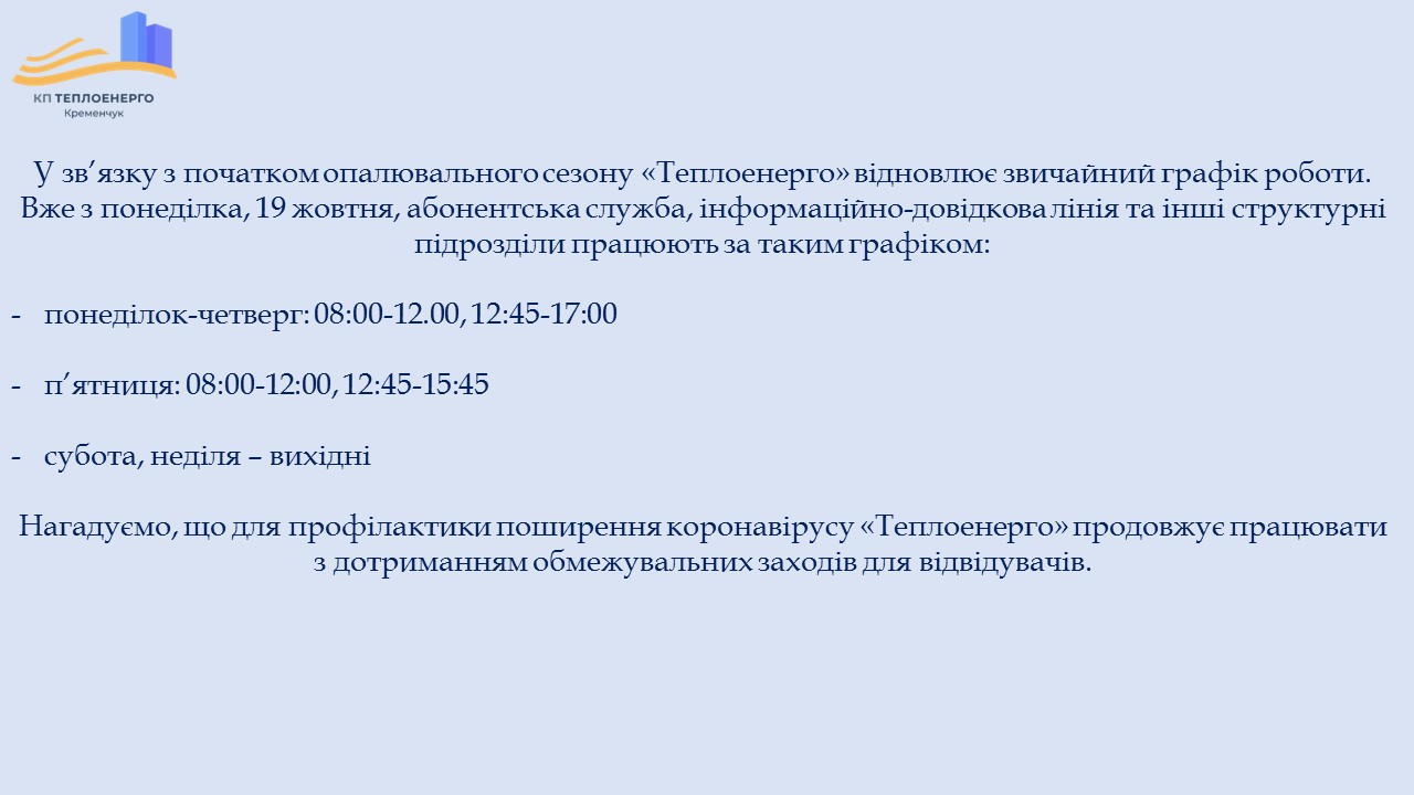 КП «Теплоенерго» відновлює п'ятиденний графік роботи